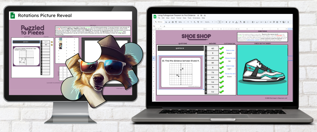 The Puzzled to Pieces one is an upgrade on a mystery puzzle. Students earn puzzle pieces but they have to put them in order at the end! The Shoe Shop one on the right allows students to customize a shoe. They can choose the type of shoe, the style, the logo, and the color!