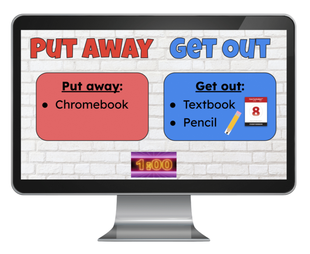 Then I will start the timer and the upbeat music will play! Students will get up, get their supplies and come back to their seats.
