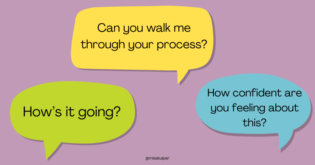 One thing that I like to do is when a student asks me, is this right, or is this correct, is to tell me what you’re thinking or walk me through your process. And that kind of helps me understand what the student is thinking and kind of formatively assess what they understand about whatever topic we’re doing. Plus, a lot of times as students kind of walk me through the process, or tell me about the problem. They’re noticing errors that they made, or things that they need to go back and fix because it didn’t make sense. And so they’re self reflecting as they’re going. And it’s helping continuing that thought process.