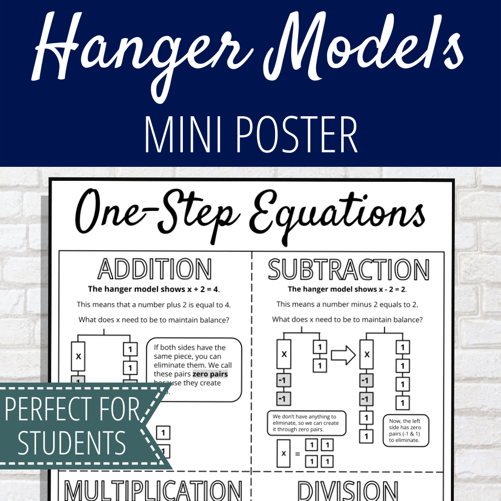 Hanger models work from one step equations to complex one variable equations. They operate similarly to Algebra Tiles, so if you’ve worked with those before, you have a head start!