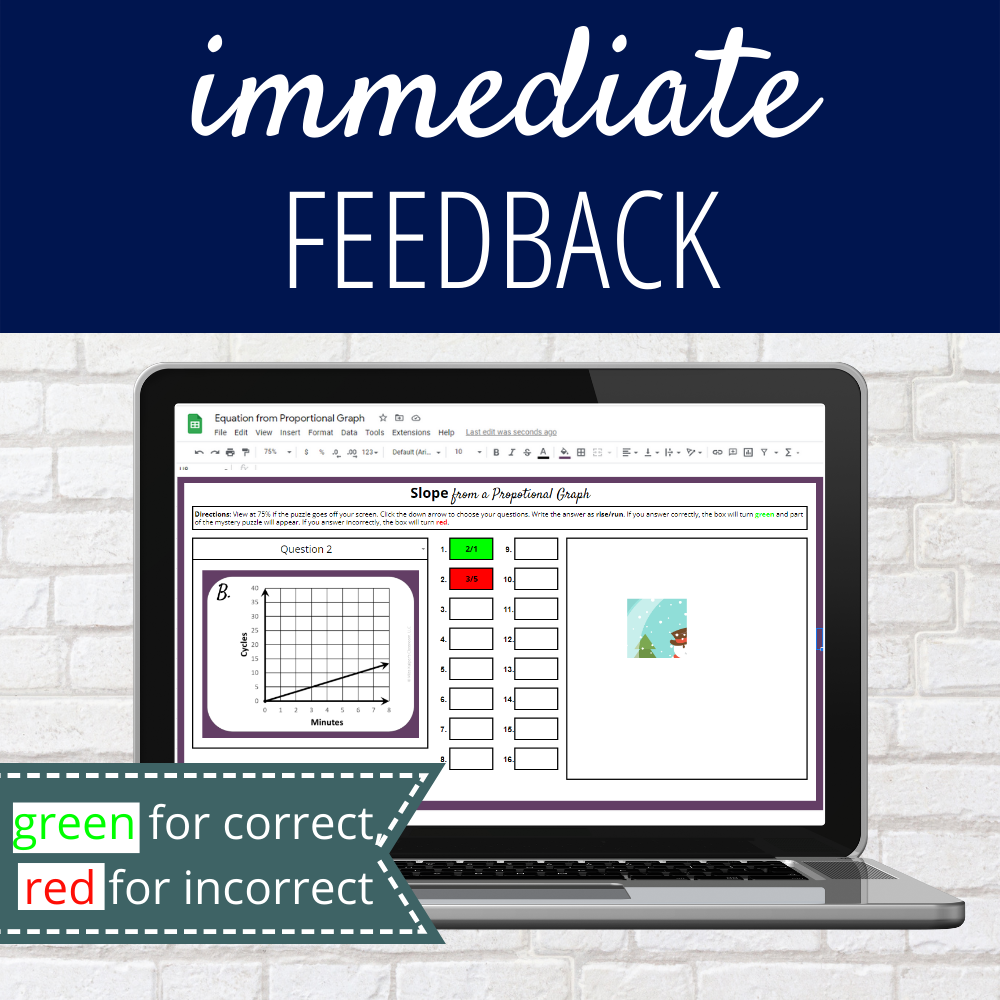 This mystery puzzle shows students immediately if they got the answer correct or not. If a student types in the correct answer, the cell in Google Sheets will turn green as well as pop up a piece of the picture. If student input the incorrect answer*, the cell turns red.