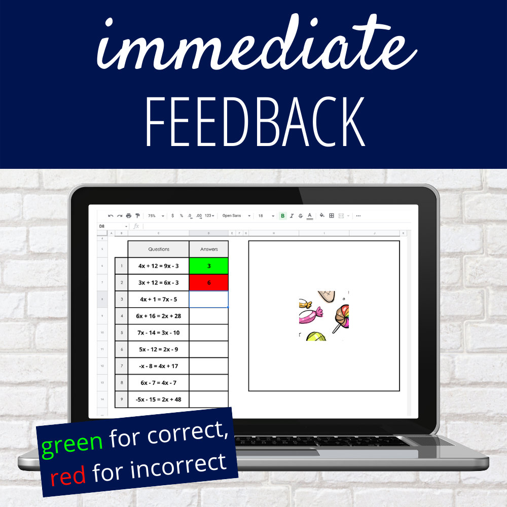 This mystery puzzle shows students immediately if they got the answer correct or not. If a student types in the correct answer, the cell in Google Sheets will turn green as well as pop up a piece of the picture. If student input the incorrect answer*, the cell turns red.