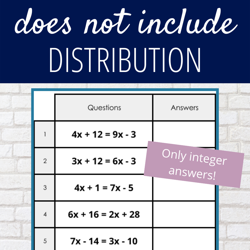 These problems do not contain distributive property. This helps students focus in on practicing the skill before adding extra pieces to it.