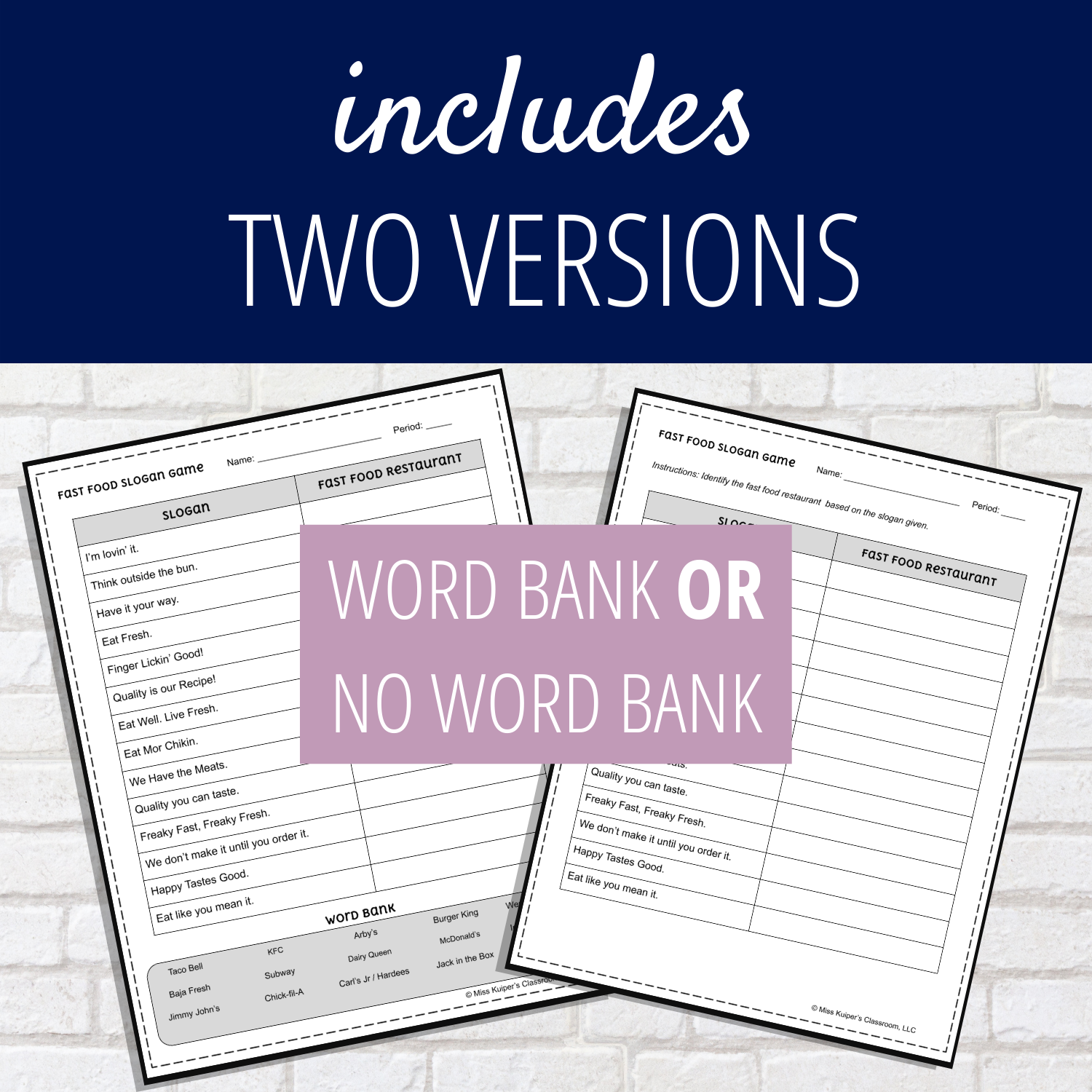 In these activities, students are given the slogan for a brand. Let’s use the example of cereal. In this Fast Food Slogan activity, students are given 14 slogans. They have to come up with what fast food restaurant goes with that slogan. Like “I’m lovin’ it” is a slogan for McDonalds. These activities also come with a word bank if you want to use that version instead. They also include a digital version to accommodate for a paperless classroom or online learning.