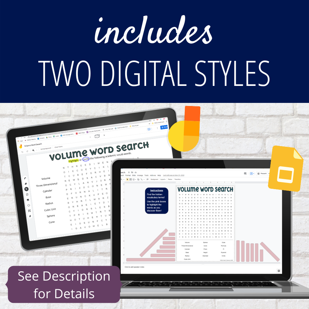 This is a Volume Vocabulary Activity includes a print and digital format. The digital format comes in two styles: Google Slides and Google Jamboard. In the Google Slides version, students will use pre-determined transparent shapes to highlight the words they find. In the Google Jamboard version, students can use the highlights tool or pen tool to find the academic words.