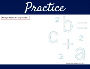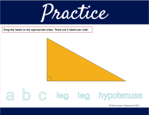 Inside of the Pythagorean Theorem Beginner’s Activity, students will interact with 6 different pieces. First will be academic vocabulary and definitions with pictures to help students understand the relationship between the vocab and the Pythagorean Theorem.