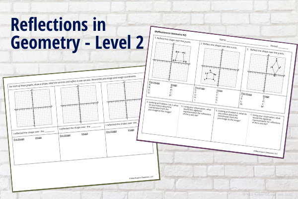 There are 2 double-sided worksheets included with this set. They are scaffolded to help students progress in their understanding from doing a reflection of a point to creating an algebraic rule. The style of problems vary to allow your students to think flexibly with reflections in geometry to gain mastery over the concept.