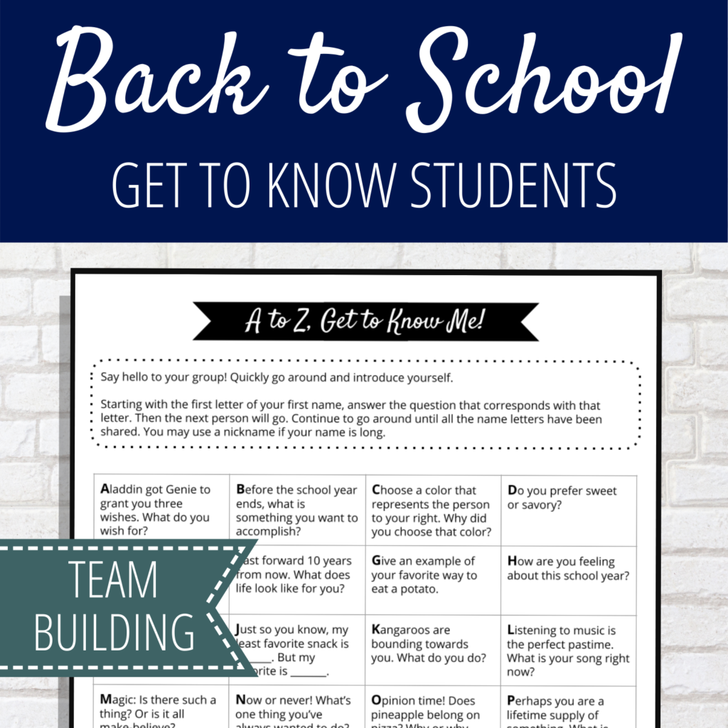 This activity has 26 wacky, serious, and funny questions for students to get to know who their classmates are. Like, letter Q says: Queen of England grants you knighthood. What did you do to deserve it? How fun is that?