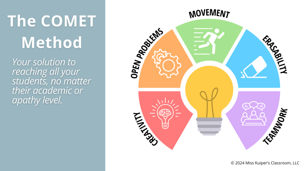 Throughout my years of teaching middle school math, I’ve noticed 5 things that have helped me mold my students into mathematicians. I call it the COMET Method. The 5 pillars represent creativity, open problems, movement, erasability, and teamwork.